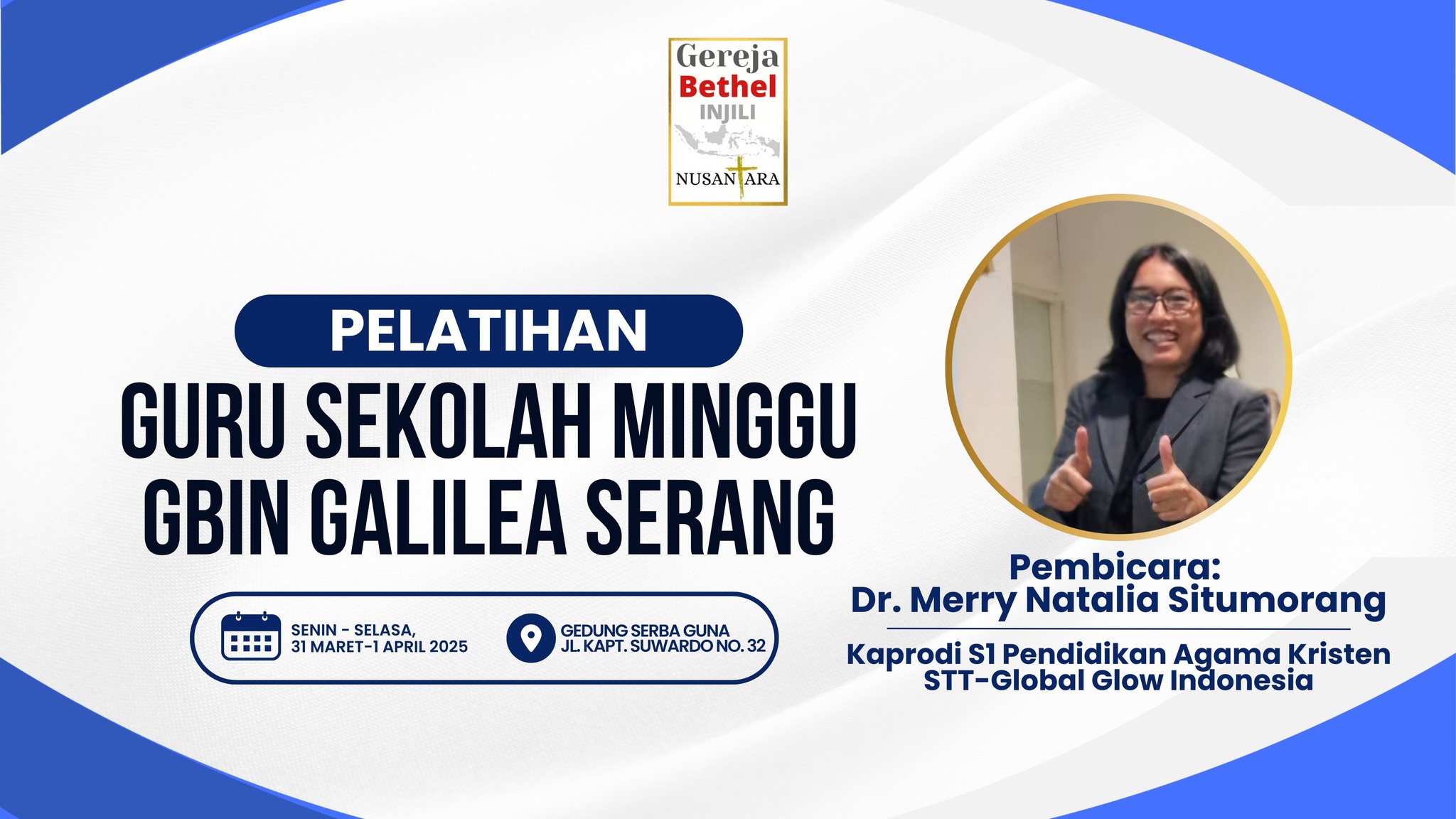 Serang - Pelatihan Guru Sekolah Minggu GBIN Galilea Serang dilaksanakan pada tanggal 31 Maret - 1 April 2025. Kegiatan ini dilakukan untuk memperlengkapi Kesiapan Guru Sekolah Minggu untuk mengajar dan mendidik generasi Gereja. "Tugas sebagai Guru Sekolah Minggu bukanlah tugas yang mudah, untuk itu diperlukan pembekalan dan pelatihan kepada Guru-Guru Sekolah Minggu agar semakin diperlengkapi dengan pengetahuan dan Firman Tuhan untuk melayani anak-anak" ungkap Wakil Gembala Pdp. Nigel.